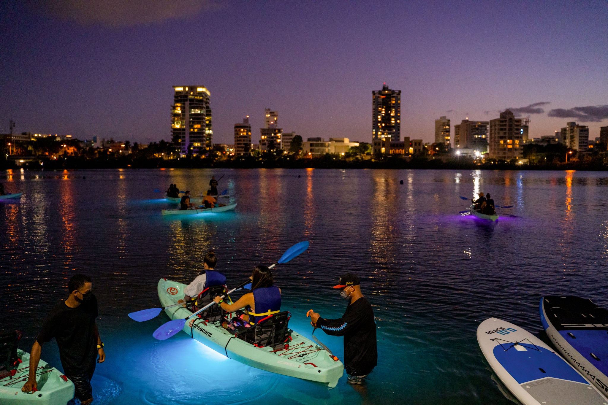 Light up the night! Experience the Condado Lagoon from a different perspective in a glow in the dark themed night kayak tour. Enjoy the action packed guided trip in one of the light up kayaks. At the end of the trip you can splash around in the water while enjoying a cold glass of champagne from the floating bar!